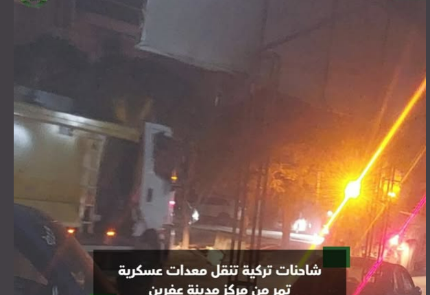 شاحنات تركية تنقل معدات عسكرية تمر من مركز مدينة عفرين