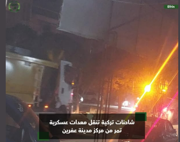 أفادت مصادر محلية لـ”عفرين الآن” عن مرور ثلاث شاحنات تركية من مركز مدينة عفرين – Efrîn، اثنتان منها محمّلتان بمولدات كهرباء خاصة بالمقرات التركية، فيما حملت الثالثة آلية عسكرية تركية.